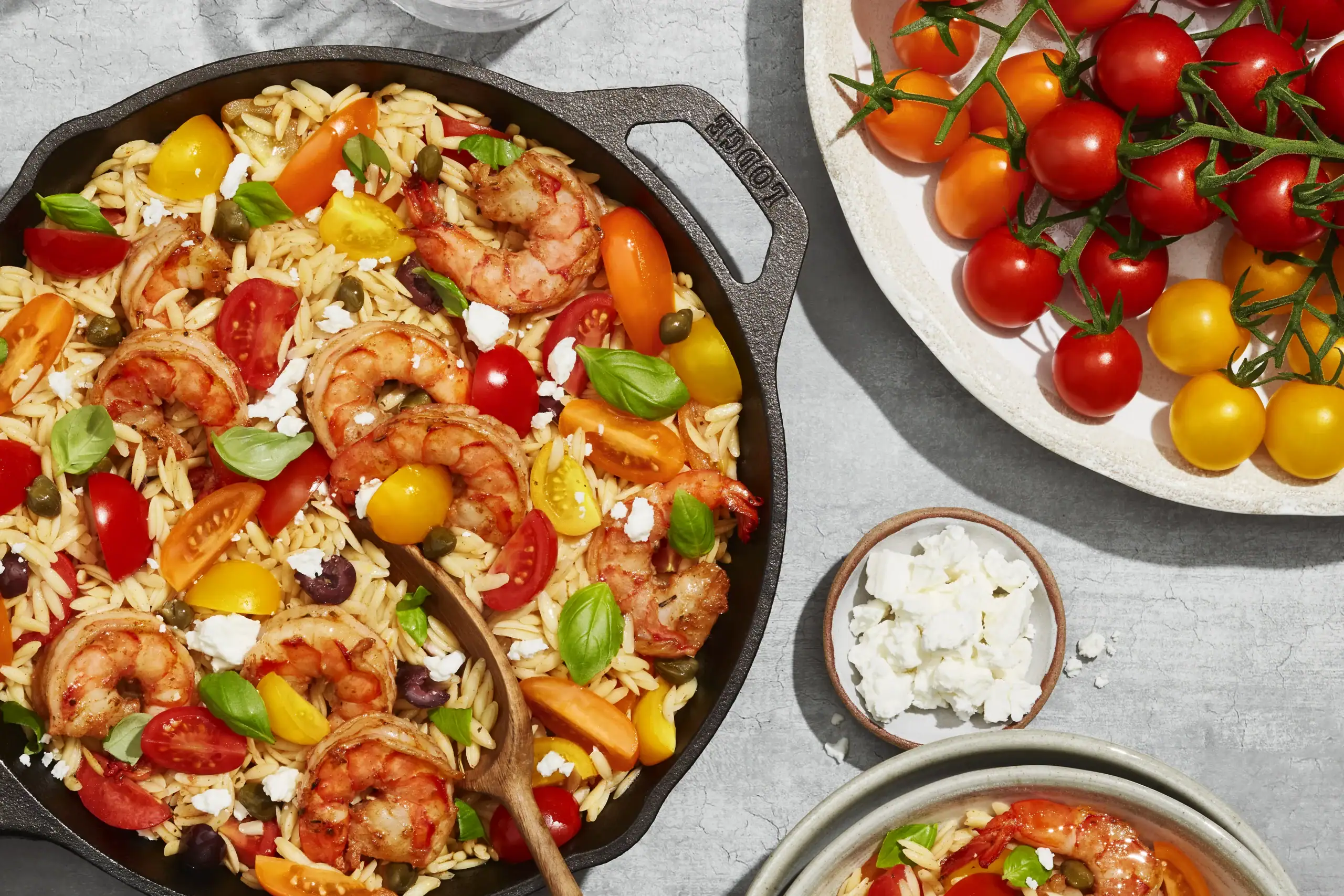 - Once the orzo is cooked, stir in half of the Bombs® Squad™ tomatoes, olives, and capers.